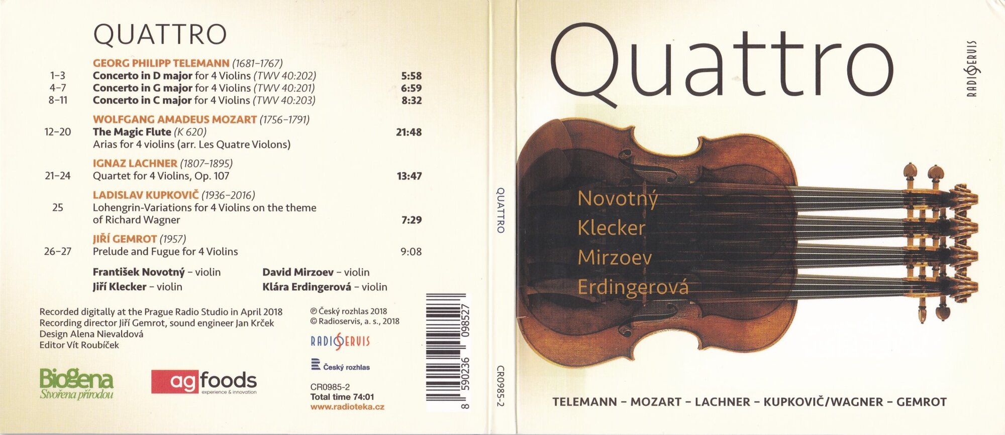 Georg Philipp Telemann, František Novotný, Jiří Klecker, David Mirzoev, Klára Erdingerová, Wolfgang Amadeus Mozart, Ignaz Lachner, Ladislav Kupkovič, Jiří Gemrot "Hráčsky i posluchačsky exkluzivní skladby pro neobvyklé nástrojové obsazení a vzájemná rezonance lidí stejného oboru jsou vzácné dary, které život nepřináší každý den. Když jsem měl to štěstí, že jsem objevil Mozartovu Kouzelnou flétnu v brilantní úpravě pro čtvery housle a Lachnerův houslový kvartet, ihned mě napadlo přizvat a představit disponované, vnímavé a v souvislostech hluboce přemýšlivé mladé houslistické osobnosti. Společně jsme se pustili do přípravy a repertoár postupně rozšířili. [...] Při studiu skladeb jsme v této koncertantně-komorní sestavě našli čiré hudební potěšení. Doufám, že jej budou posluchačí tohoto CD s námi sdílet." QUATTRO František Novotný - housle Jiří Klecker - housle David Mirzoev - housle Klára Erdingerová - housle Quattro: Telemann-Mozart-Lachner-Kupkovič/Wagner-Gemrot