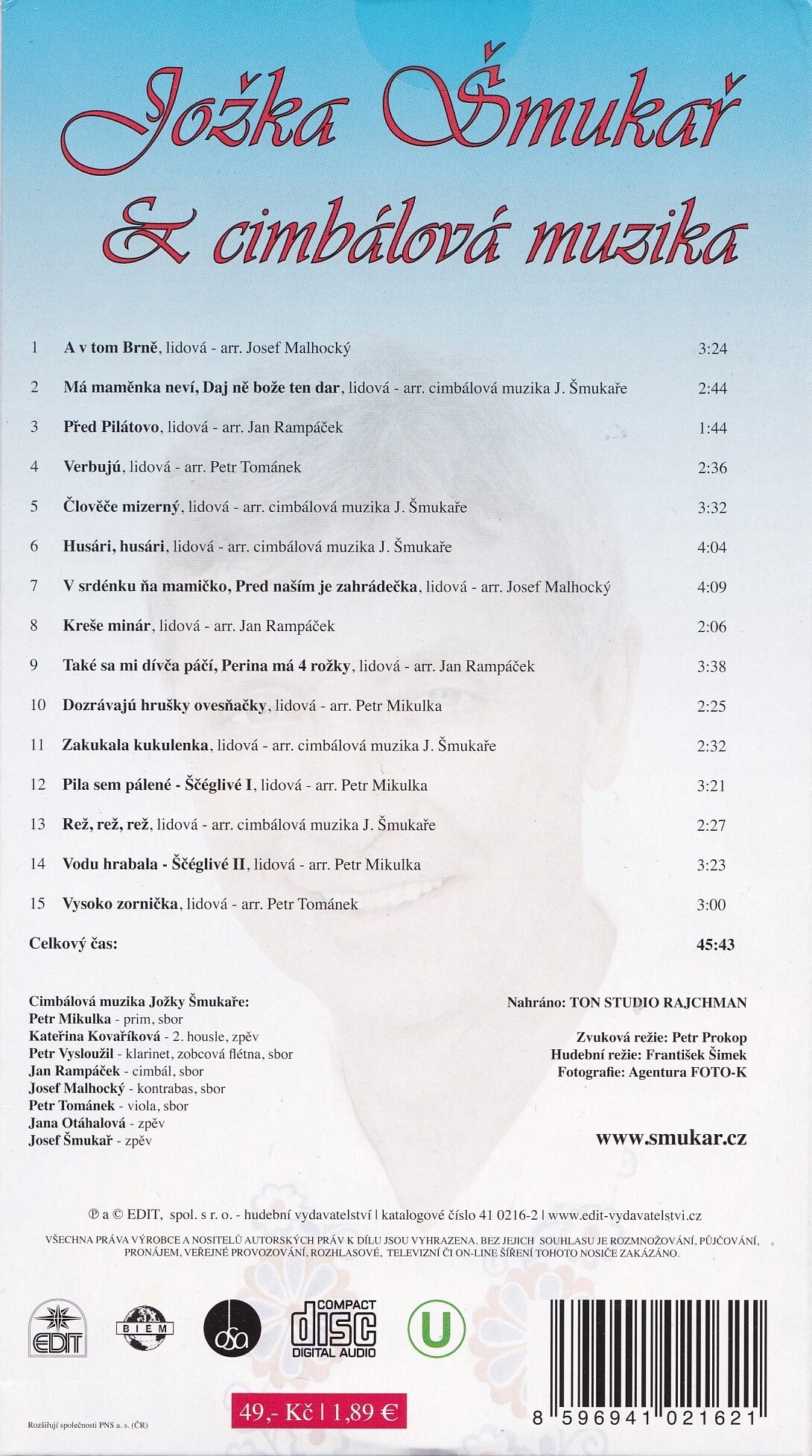 Cimbálová muzika Jožky Šmukaře hraje ve složení: Petr Mikulka – prim, sbor, Kateřina Kovaříková – 2.housle, zpěv, Petr Vysloužíl – klarinet, zobcová fléna, sbor, Jan Rampáček – cimbál, sbor, Josef Malhocký – kontrabas, sbor, Petr Tománek – viola, sbor Skladby 1. A v tom Brně – lidová 03:24 2. Má maměnka neví, Daj ně bože ten dar – lidová 02:44 3. Před Pilátovo – lidová 01:44 4. Verbujú – lidová 02:36 5. Člověče mizerný – lidová 03:32 6. Husári, husári – lidová 04:04 7. V srdénku ňa mamičko, Pred naším je zahrádečka – lidová 04:09 8. Kreše minár – lidová 02:06 9. Také sa mi dívča páčí, Perina má 4 rožky – lidová 03:38 10. Dozrávajú hrušky ovesňačky – lidová 02:25 11. Zakukala kukulenka – lidová 02:32 12. Pila sem pálené – Ščéglivé I – lidová 03:21 13. Rež, rež, rež – lidová 02:27 14. Vodu hrabala – Ščéglivé II – lidová 03:23 15. Vysoko zornička – lidová 03:00