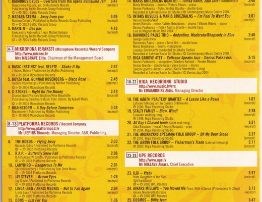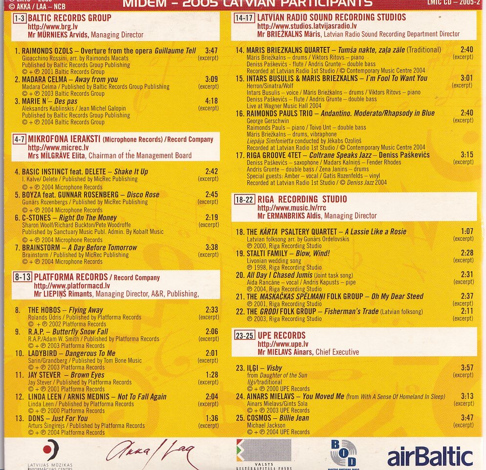 Tento CD byl vytvořen pro prezentaci na MIDEM 2005 a obsahuje výběr různých lotyšských interpretů z různých hudebních žánrů, jako je pop, rock, jazz a etnická hudba. CD bylo vyrobeno pouze pro propagační účely a není určeno k prodeji.