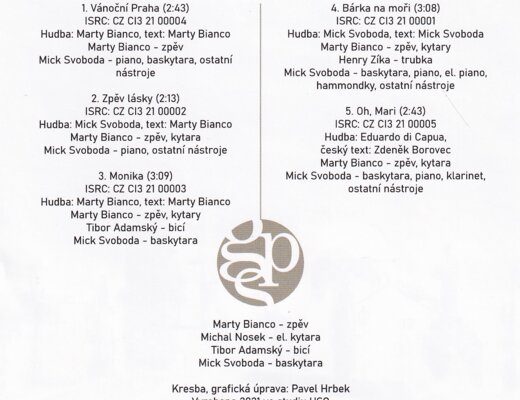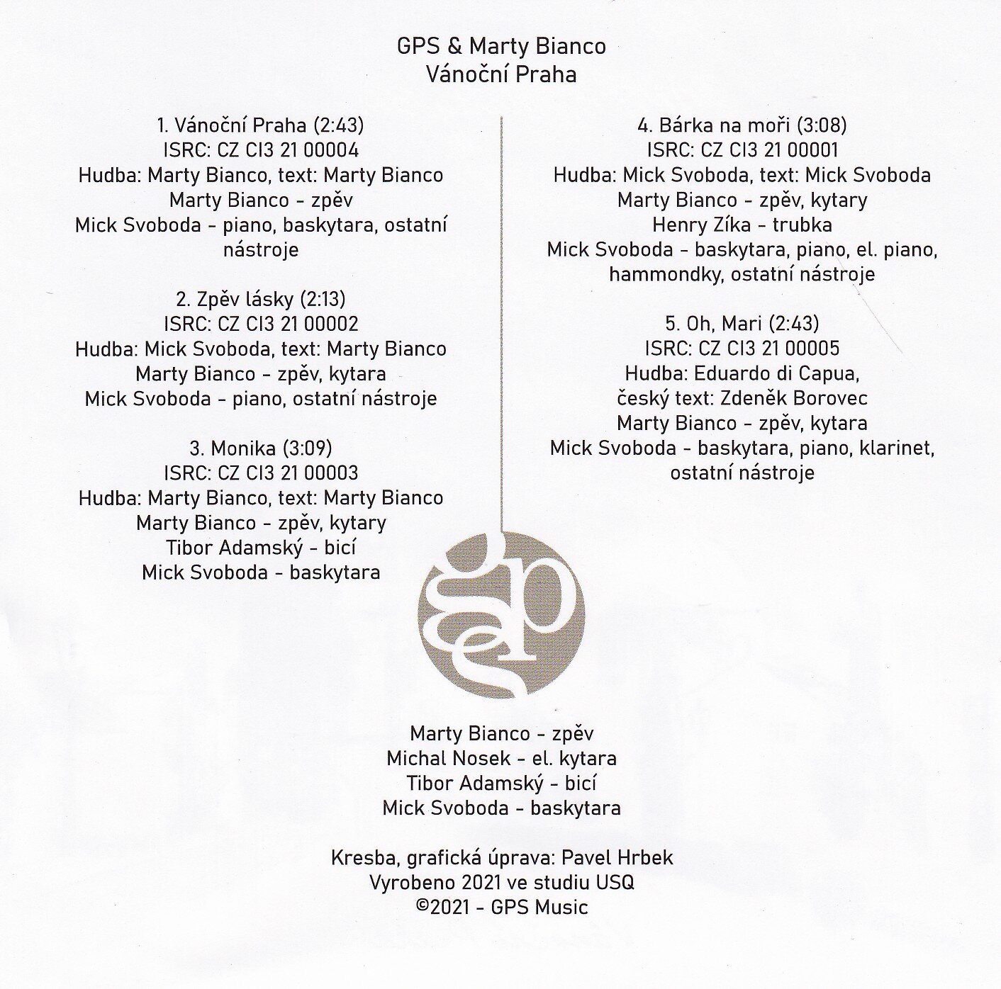 Album „Vánoční Praha“ od GPS and Marty Bianco přináší atmosféru svátečního města s pěti originálními skladbami. Každá z písní je unikátní díky nezaměnitelnému zpěvu Marty Bianca a bohaté instrumentaci, kterou doplňují Michal Nosek na elektrickou kytaru, Tibor Adamský na bicí a Mick Svoboda na baskytaru, piano a další nástroje. Album bylo nahráno v roce 2021 ve studiu USQ a je výjimečné svou poetikou a hudební propracovaností.