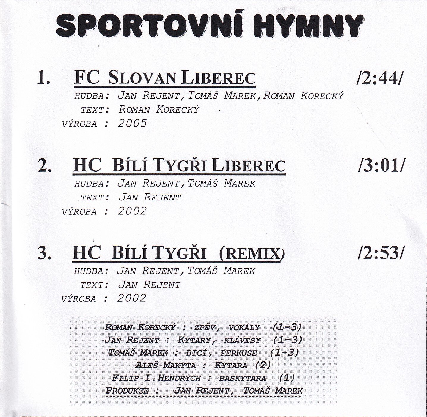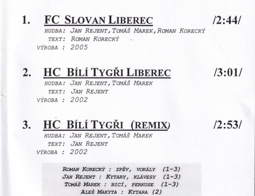 Album „Sportovní Hymny“ obsahuje tři skladby věnované sportovním týmům z Liberce, přičemž každá z nich je hudebně unikátní a odráží podporu pro místní kluby. Jedná se o energické a motivační hymny, které zaujmou fanoušky nejen svou melodií, ale i texty oslavujícími sportovní tradici. Na albu se podíleli zkušení hudebníci a hosté, kteří přidali albu výjimečný zvuk.