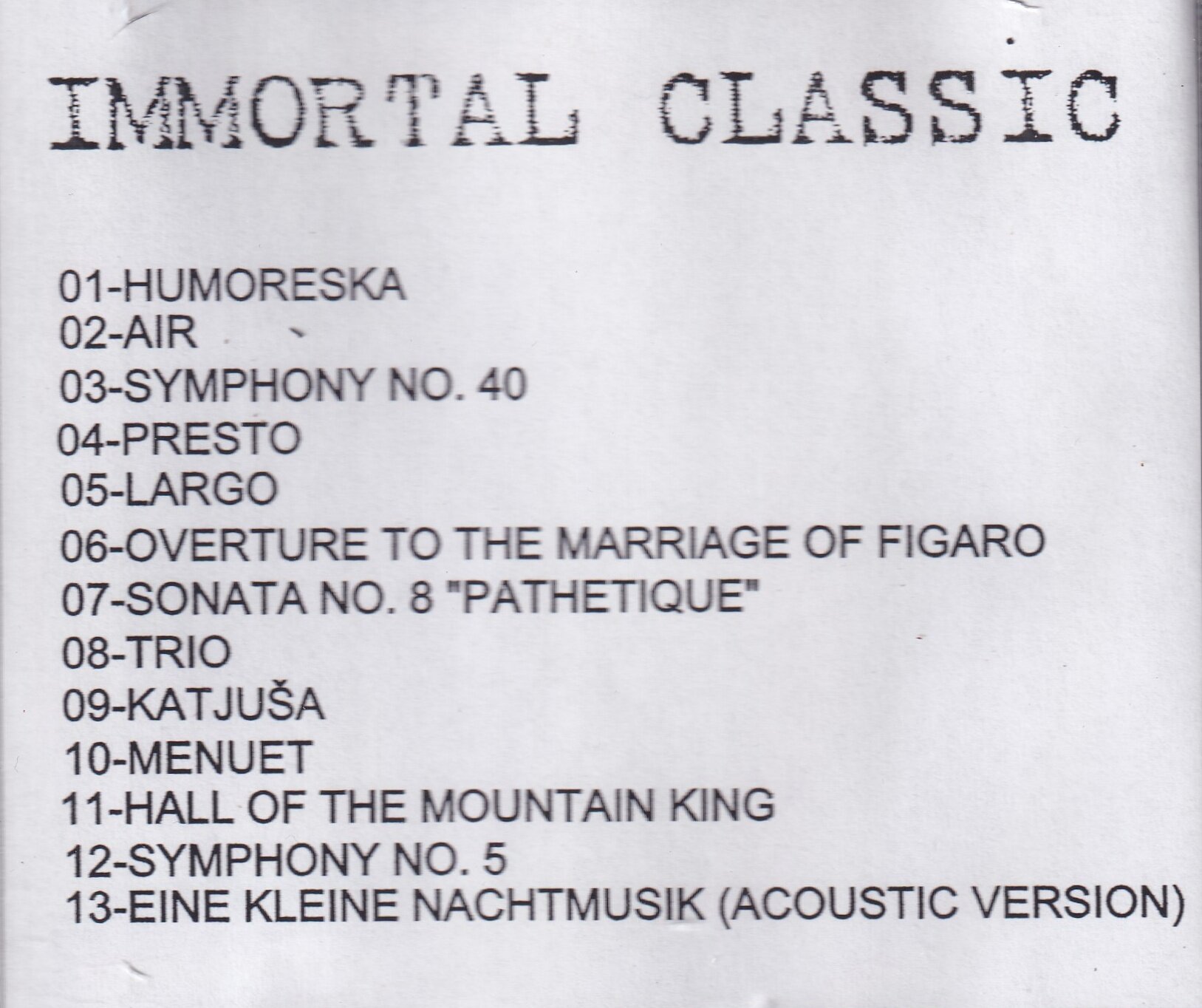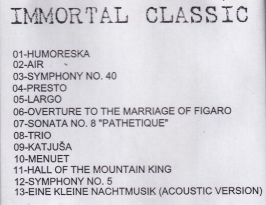 Album "Immortal Classic" obsahuje 13 skladeb, které kombinují klasickou hudbu s moderním stylem. Přináší nové pojetí známých klasik, jako je Beethoven, Mozart, Dvořák nebo Čajkovskij. Skladby jsou nahrané v unikátní aranži, která zaujme jak milovníky klasiky, tak moderních interpretací.