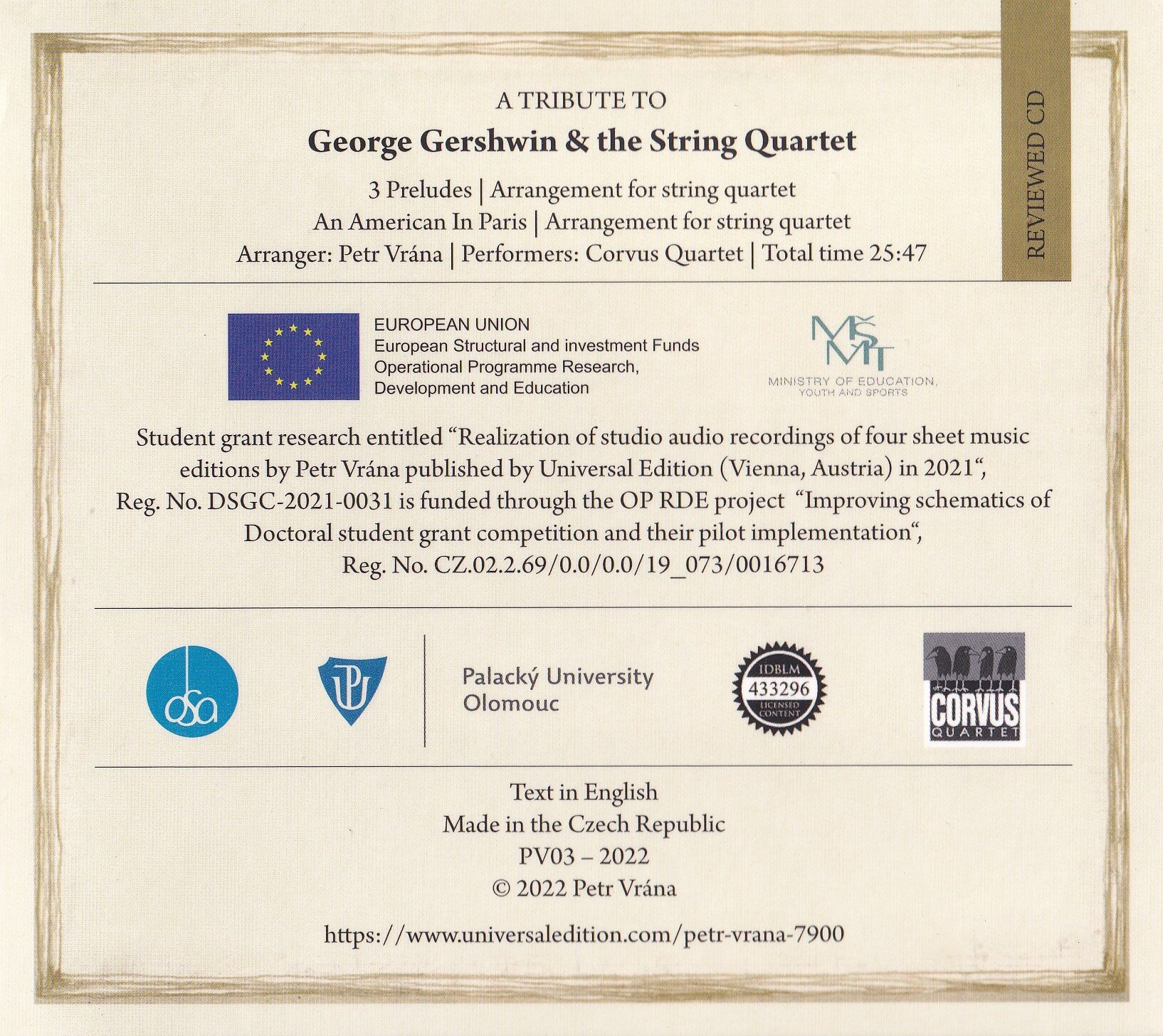Album A Tribute to George Gershwin and the String Quartet přináší jedinečné úpravy skladeb slavného amerického skladatele George Gershwina pro smyčcový kvartet. Aranžmá vytvořil Petr Vrána a interpretuje je soubor Corvus Quartet. Tento projekt vznikl v rámci studentského grantového výzkumu a byl publikován v Universal Edition ve Vídni. Nahrávka zachycuje nadčasovou krásu Gershwinovy hudby v novém komorním pojetí.