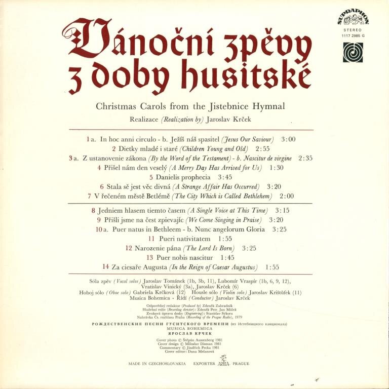 In Hoc Anni CirculoJežíš Náš Spasitel (Jesus Our Saviour)Dietky Mladé I Staré (Children Young And Old)Z Ustanovenie Zákona (By The Word Of The Testament)Nascitur De VirginePřišel Nám Den Veselý (A Merry Day Has Arrived For Us)Danielis PropheciaStala Sě Jest Věc Divná (A Strange Affair Has Occurred)V Řečeném Městě Betlémě (The City Which Is Called Bethlehem)Jedniem Hlasem Tiemto Časem (A Single Voice At This Time)Přišli Jsme Na Čest Zpievajíc (We Come Singing In Praise)Puer Natus In BethleemNunc Angelorum GloriaPueri NativitatemNarozenie Pána (The Lord Is Born)Puer Nobis NasciturZa Ciesaře Augusta (In The Reign Of Caesar Augustus)