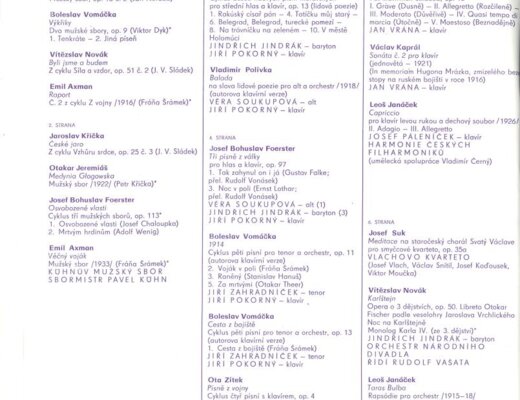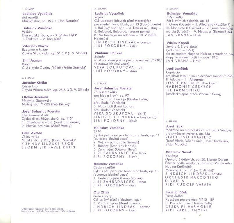 Jindřich Jindrák, Jiří Pokorný, Věra Soukupová, Jiří Pokorný, Jiří Zahradníček, Jan Vrána, Josef Páleníček, Vlachovo kvarteto, Orchestr Národního divadla, Česká filharmonie
