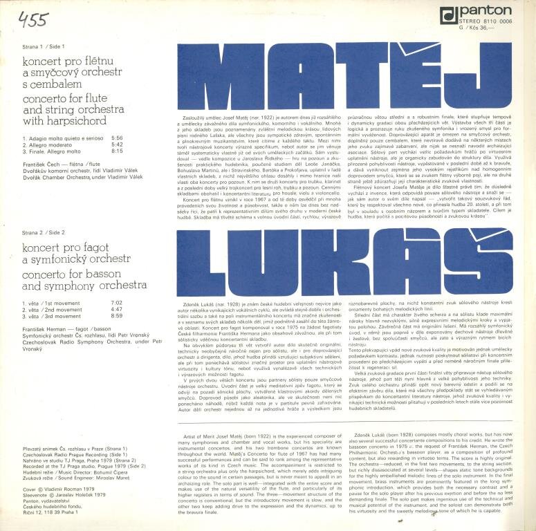 Josef Matěj - Koncert pro flétnu a smyčcový orchestr s cembalem, Zdeněk Lukáš - Koncert pro fagot a symfonický orchestr