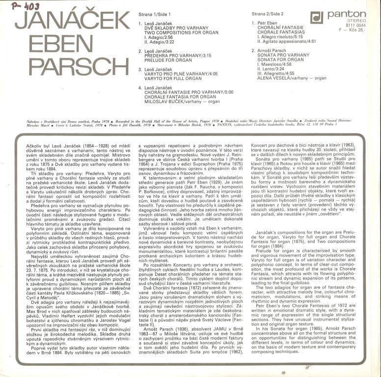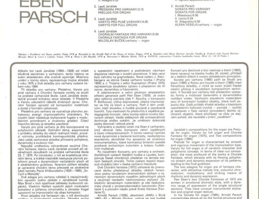 Janáček - Dvě skladby pro varhany, Eben - Předehra pro varhany, Varyto pro plné varhany, Chorální fantasie pro varhany, Parsch , Sonáta pro varhany