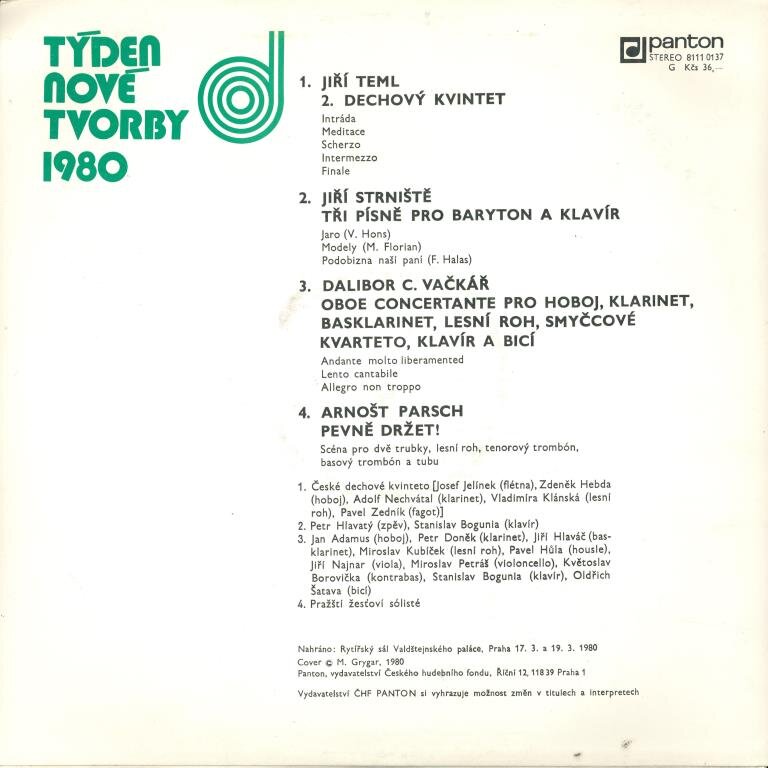 Petr Hlavatý, Stanislav Bogunia, Jan Adamus, Petr Doněk, Jiří Hlaváč, Miroslav Kubíček, Pavel Hůla, Jiří Najnar, Miroslav Petráš, Květoslav Borovička, Stanislav Bogunia, Odlřich Šatava, Pražští žesťoví sólisté