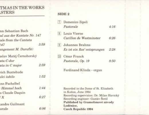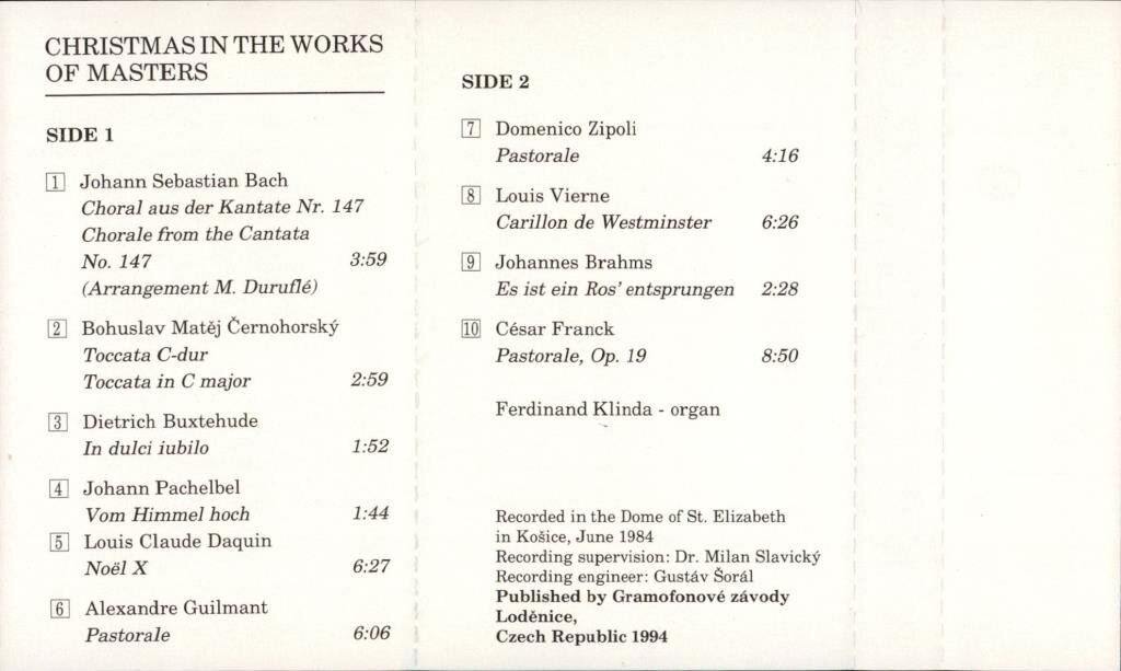 J. S. Bach, B. M. Černohorský, D. Buxtehude, J. Pachelbel, D. Zipoli. L. Cl. Daguin, L. Vierne, A. F. Guilmant, J. Brahms, C. Franck