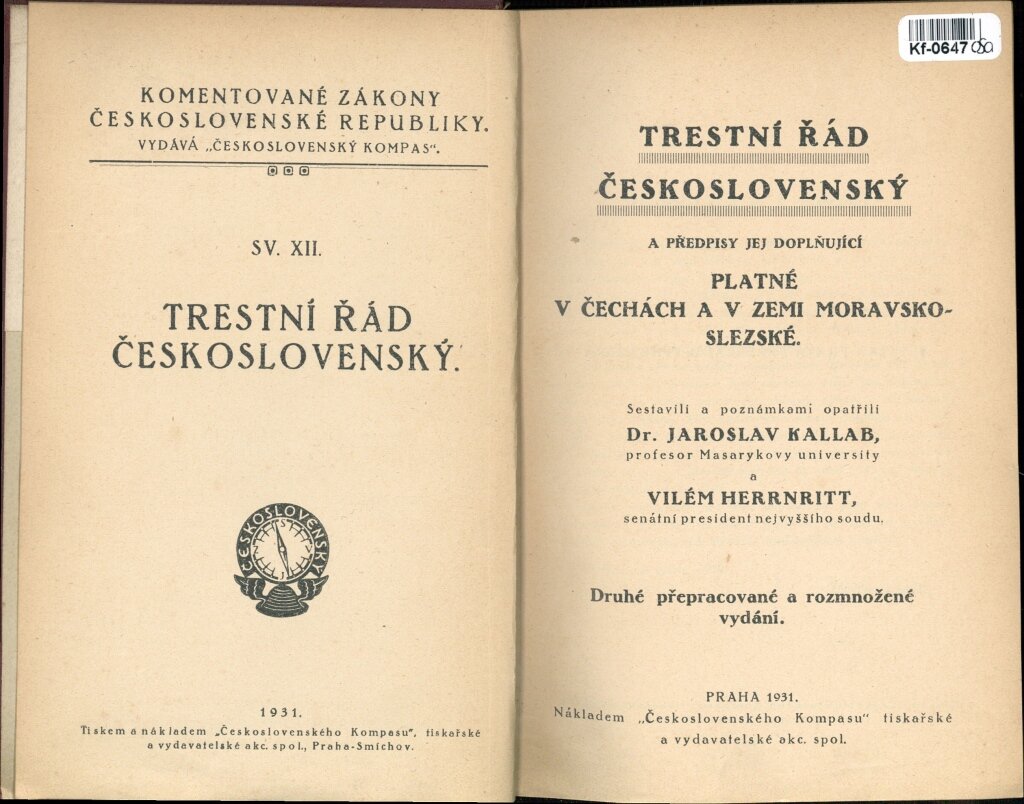 Trestní řád Československý a předpisy jej doplňující platné v Čechách a v zemi Moravsko - Slezské