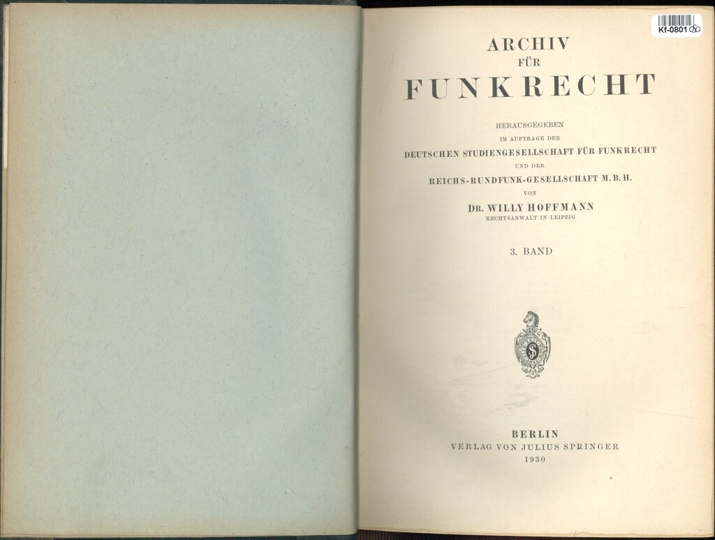 ARCHIV FÜR FUNKRECHT - HERAUSGEGEBEN IM AUFTRAGE DER DEUTSCHEN STUDIENGESELLSCHAFT FÜR FUNKRECHT UND DER REICHS - RUNDFUNK - GESELLSCHAFT M. B. H. - III. Band
